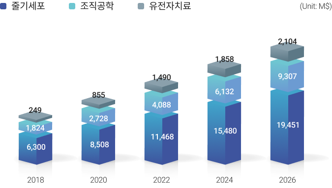 손상된 인체의 세포나 조직, 장기를 대체하거나 재생시켜 정상 기능을 복원하거나 새로 만들어내는 의료기술로 줄기세포 기반 제품의 확장은 재생의학 시장의 빠른 성장을 이끄는 핵심 원동력입니다.
